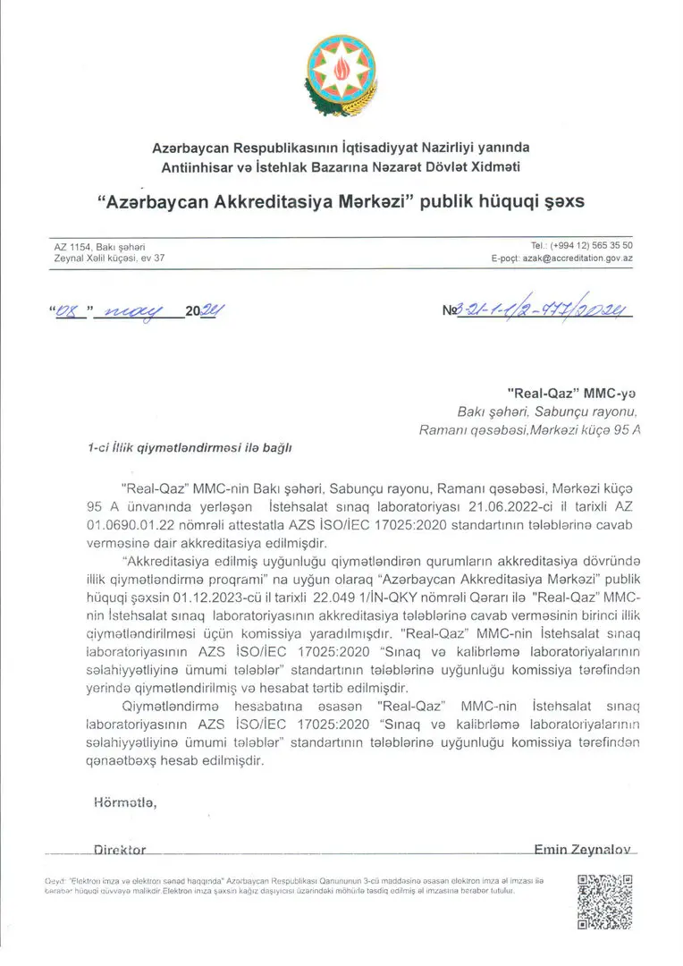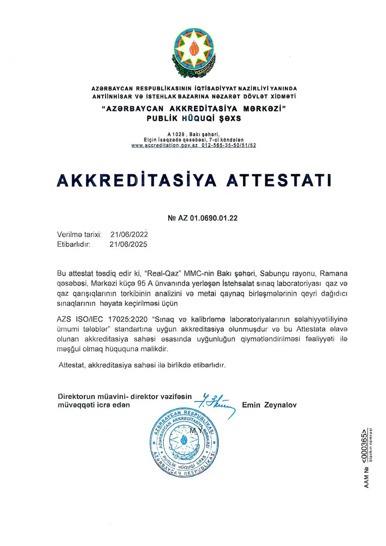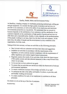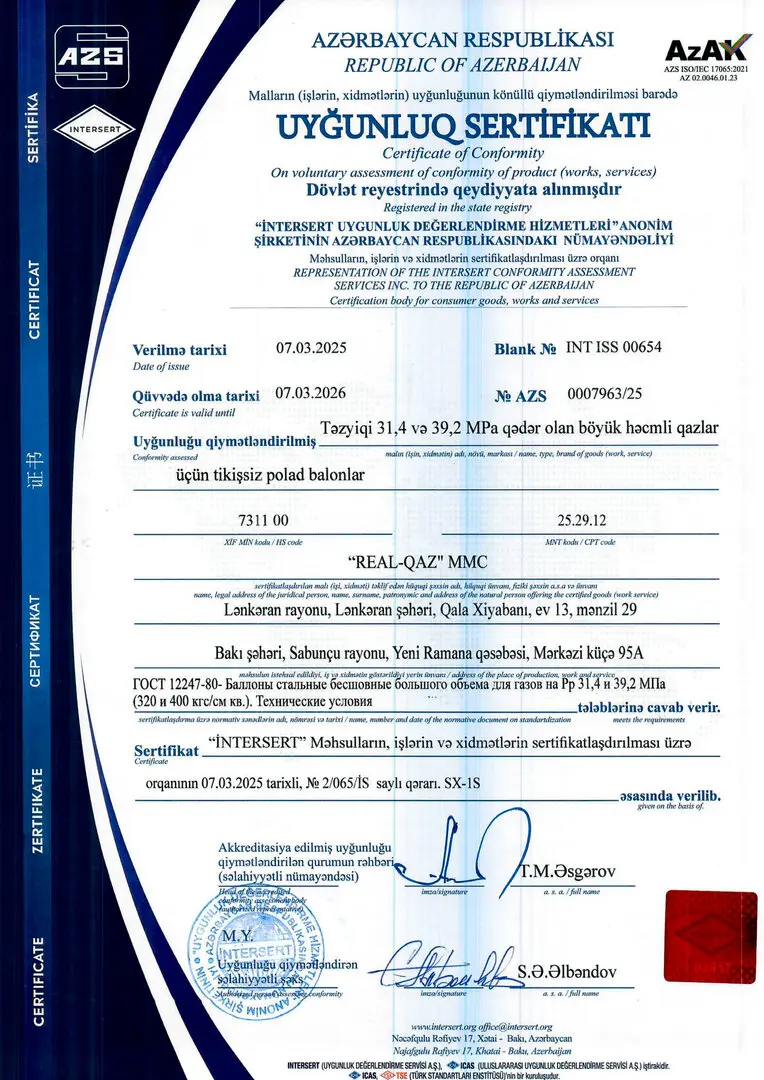 RealGaz, teknik gazlar sektöründe Azerbaycan’da ISO 9001:2000 sertifikasını alan ilk şirket olmuştur. Bu sertifika, 7 Aralık 2005’te OHSAS 18001:2007 sertifikası ile birlikte verilmiştir. Mükemmeliyete olan bu öncü bağlılık, bizi bölgenin kalite lideri olarak tanıtmıştır.