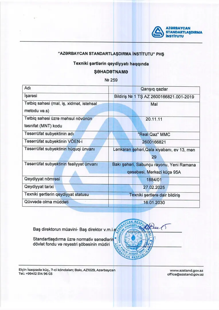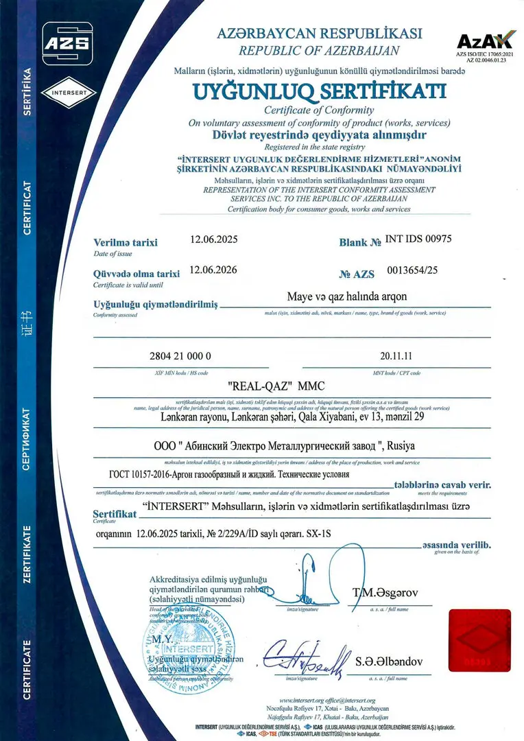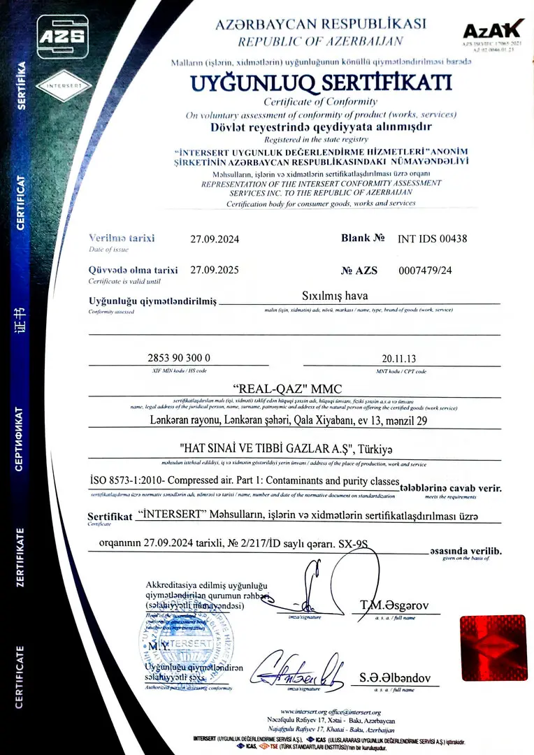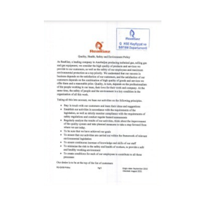 RealGaz, teknik gazlar sektöründe Azerbaycan’da ISO 9001:2000 sertifikasını alan ilk şirket olmuştur. Bu sertifika, 7 Aralık 2005’te OHSAS 18001:2007 sertifikası ile birlikte verilmiştir. Mükemmeliyete olan bu öncü bağlılık, bizi bölgenin kalite lideri olarak tanıtmıştır.